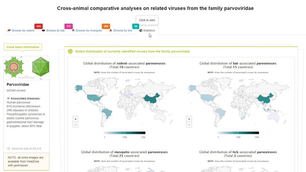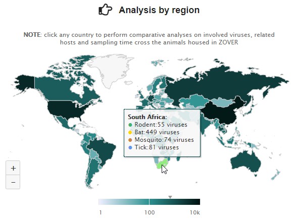 Users can click any country to perform comparative analyses on involved viruses realted hosts and sampling time cross the animals housed in ZOVER.