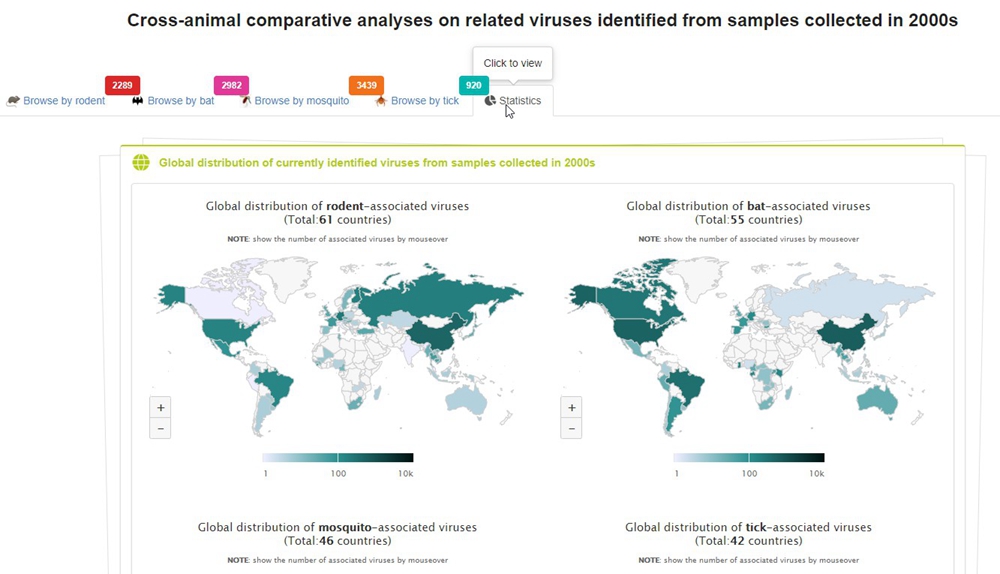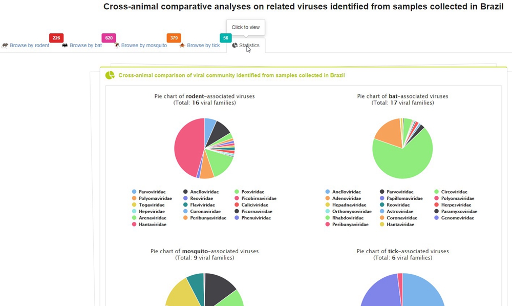 HOSTS INFORMATION There are two ways as following: (i) click one of buttons in the menu panel of 'Browse certain animal-assosicated viruses' on the Home page, or (ii) click the 'Browse by rodent/chiroptera/mosquito/tick' tab on the mainTable second page.For brevity, the taxonomic tree shows to only family level, but it can be further expanded to genus/species level by single click the branch of the tree.