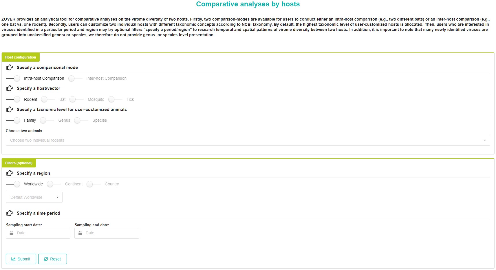 Users can click 'Click to customize the hosts' button to perform comparative analyses on involved viruses realted geographic distribution and sampling time cross the animals housed in ZOVER.